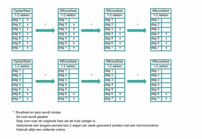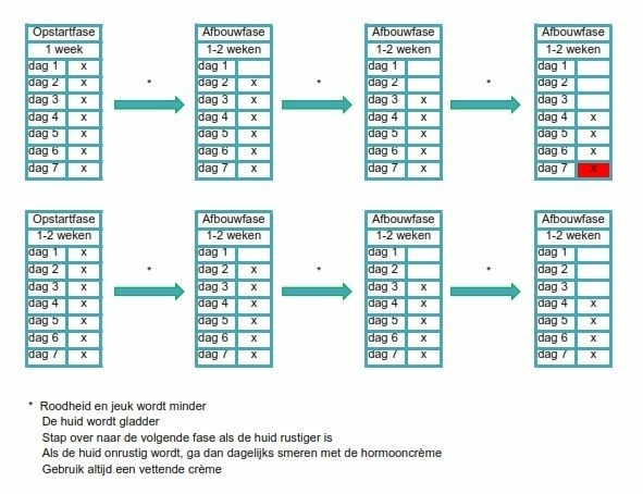 We gebruiken het op- en afbouwschema. Zo gebruiken wij zo weinig mogelijk hormooncrème.