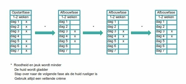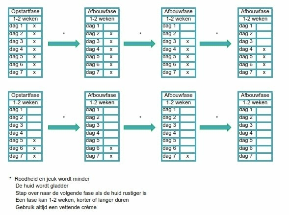 - In de acute fase moet men 1 maal daags smeren om de klachten te onderdrukken. Daarna mag afgebouwd worden, eventueel tot een onderhoudsfase