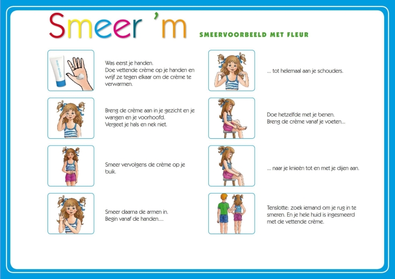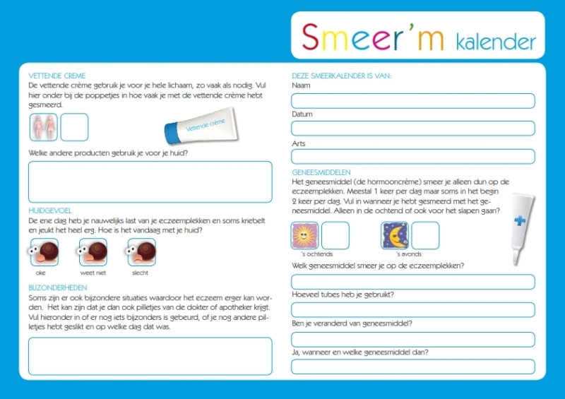 Om je actief te betrekken bij de behandeling van je huid mag je in de smeerkalender tekenen hoeveel jeuk je hebt gehad en hoeveel vingertopjes hormoon crème je gebruikt hebt. Ook kan je tekenen hoe vaak je je lichaam ingesmeerd hebt met een vettende crème.