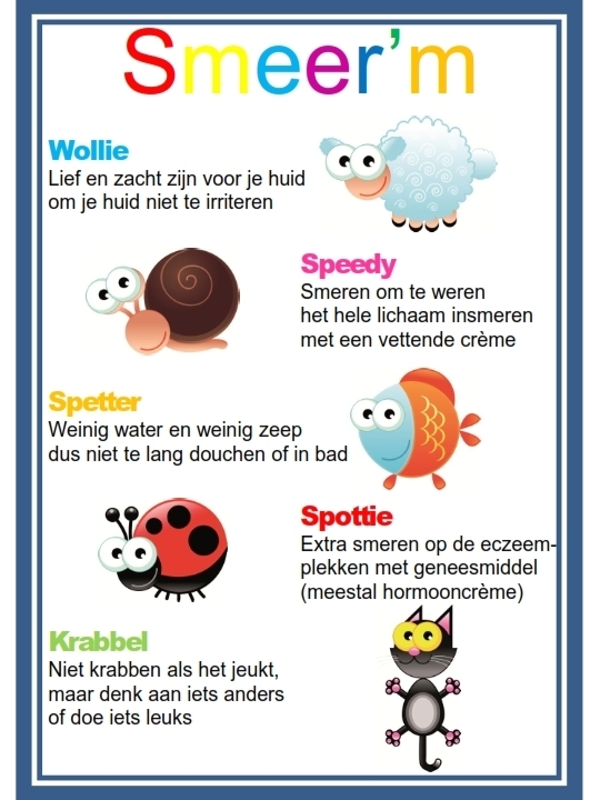 In dit boekje leggen de dierfiguren je uit wat eczeem is en hoe je ermee om kunt gaan. Een overzichtelijke poster maakt je behandelplan klip en klaar