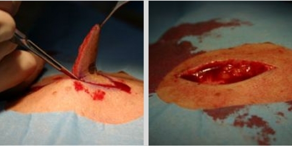 Nadat je plaats heeft genomen op de behandeltafel, wordt het te behandelen gebied schoongemaakt met chloorhexidine (een desinfecterend middel). Dan volgt er een plaatselijke verdoving door middel van een injectie. Het inspuiten van de vloeistof voelt wat branderig aan. Na de verdoving voel je geen pijn meer. Je voelt wel dat de dermatoloog bezig is. Na de ingreep krijg je een pleister die je regelmatig moet vervangen. Je kan het beste zonder pleister douchen. De wond mag gewoon met water en zeep gereinigd worden.