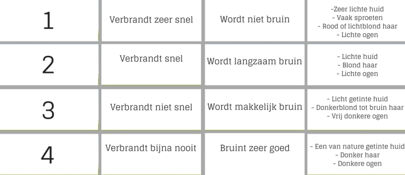 In deze tabel staan de huidtypen en hun kenmerken samengevat: