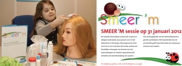 Hallo, ik ben Charlotte. Ik ben 10 jaar oud en ik help mijn moeder in het eczeemcentrum Smeer’m. Ik zal eerst vertellen wat het Eczeemcentrum Smeer’m is. In 2011 heeft mijn moeder samen met Hilde het eczeemcentrum opgericht. Hilde is een kinderarts en bij haar komen veel kinderen met eczeem en allergieën. Mijn moeder is huiddokter en bij haar komen ook elke dag kinderen met eczeem. Hilde en mijn moeder geven samen eczeemavonden om kinderen te leren wat eczeem is en wat ze eraan kunnen doen. Ze zeggen altijd in koor “Eczeem weren door te smeren” en “smeren kun je leren”. Ik mag altijd helpen en we maken van de avonden altijd iets leuks.