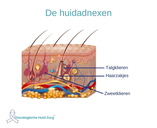 In de huid bevinden zich vervolgens zogenaamde huidadnexen. Hiermee worden haarzakjes, talg- en zweetklieren bedoeld. De haren hebben een beperkte functie bij de mens.