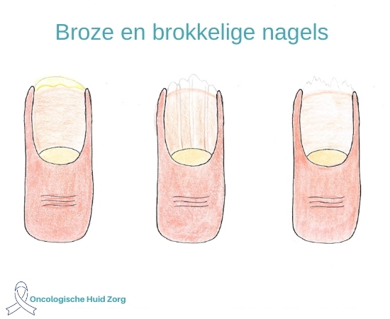 1. Broze, brokkelige en gespleten nagels: medicijnen tegen kanker remmen de vorming van de nagelplaat cellen in de nagelmatrix. Hierdoor wordt een zwakkere nagelplaat gevormd die broos is, gemakkelijk afbrokkelt en splijt. Na het stoppen van de medicijnen kunnen de nagels na verloop van tijd weer steviger worden.