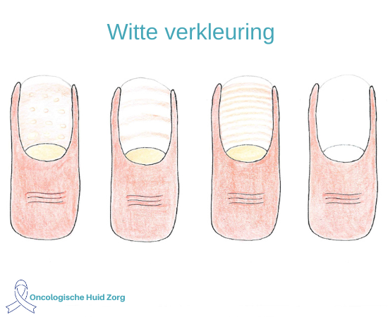2. Witte verkleuringen in de nagels: als de cellen die de nagelplaat vormen in de matrix niet goed kunnen uitrijpen dan wordt dit in de nagel zichtbaar als witte strepen of witte vlekken. Dit is een onschuldige afwijking. Na het stoppen van de medicijnen groeien de nagels langzaam weer normaal zonder verkleuringen uit.