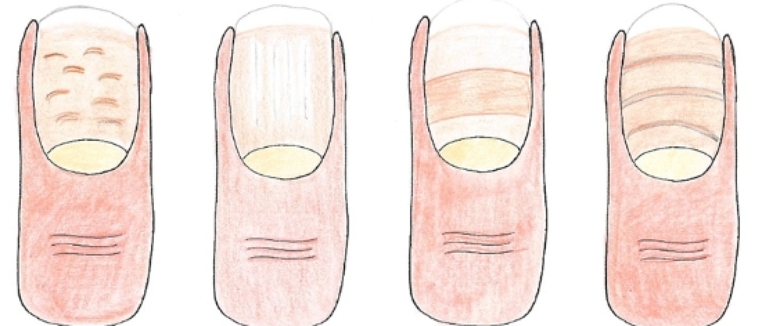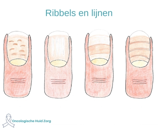 3. Ribbels of lijnen in de nagelplaat: Sommige medicijnen veroorzaken ribbels en/of gekleurde lijnen in de nagelplaat. Ze zullen gewoonlijk verdwijnen als de nagel volledig is uitgegroeid. Meestal zijn dit soort aandoeningen niet pijnlijk. Ze verdwijnen als de behandeling stopt en ze groeien samen met de nagel uit.