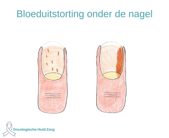 7. Bloeduitstortingen onder de nagel: er kunnen kleine bloeduitstortingen in het nagelbed ontstaan. Deze zijn zichtbaar als kleine rode lijntjes in de nagels. Soms zijn er grotere bloedingen onder de nagel. Deze zijn vaak pijnlijk en kunnen infecteren.