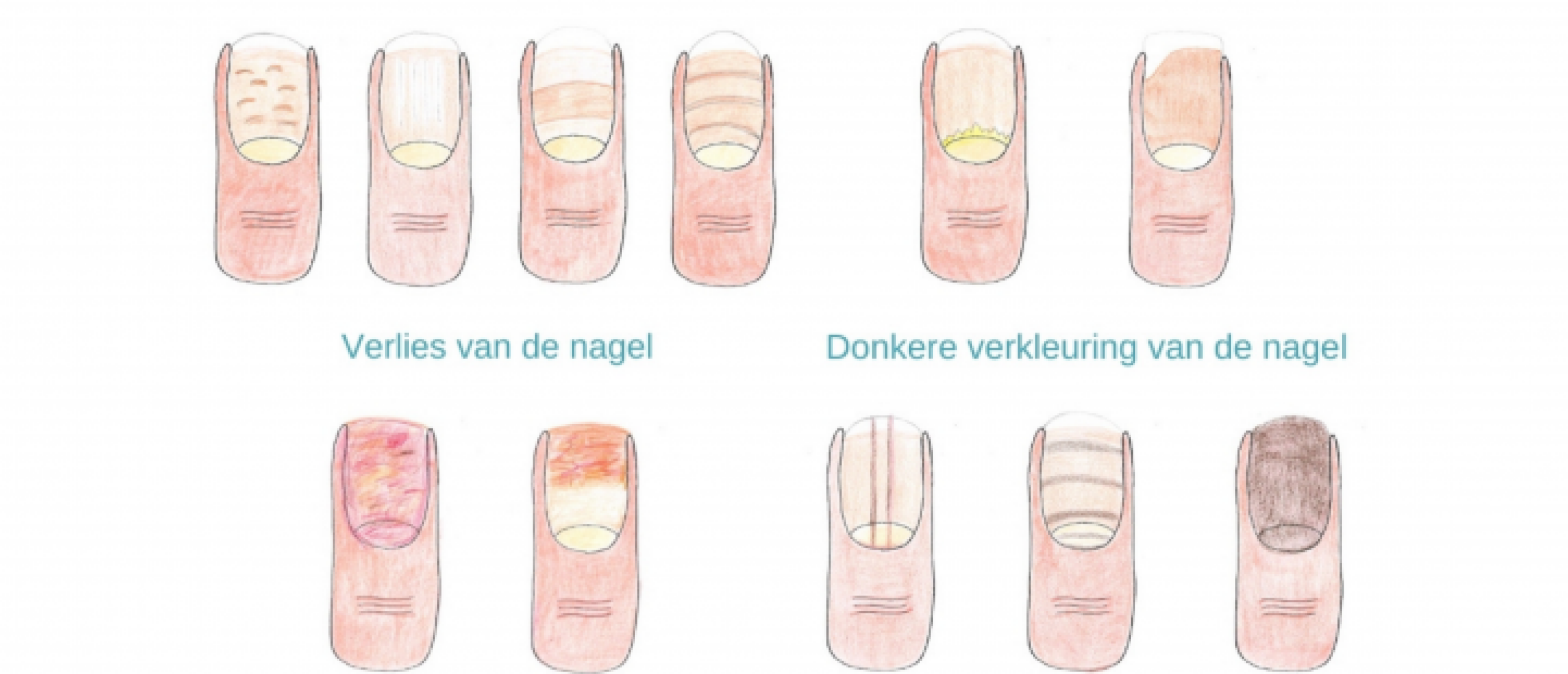 - Veranderingen in de kleur van de nagelplaat of van het nagelbed