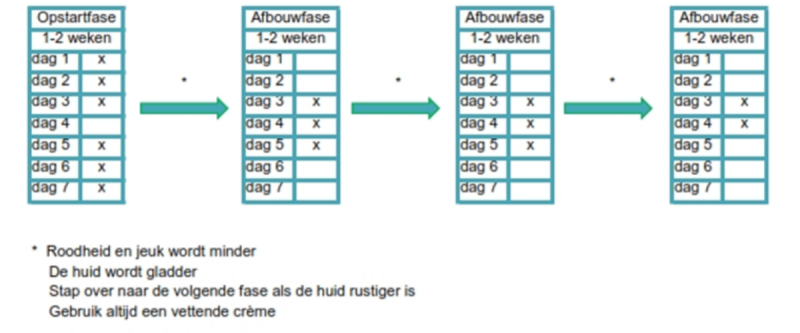 Het is beter om niet te wachten tot de psoriasis ernstig is om te beginnen smeren. Het is beter om gelijk in te grijpen bij de eerste tekenen en te smeren tot de psoriasis weg is. Hierdoor is de psoriasis sneller onder controle. Als de psoriasis actief is (rode jeukende huid) moet men 1 maal daags een dermatocorticosteroïd smeren op de plekken om de klachten te onderdrukken (opstartfase). Daarna mag afgebouwd worden (afbouwfase). Eventueel tot een onderhoudsfase of tot het stoppen van het gebruik. Bij hardnekkige psoriasis plekken kan occlusie therapie toegepast worden.