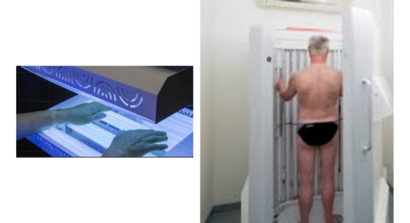 Er zijn 2 vormen van lichttherapie: Uv-B en PUVA. Uv-B (ultraviolet B) is een straling met een golflengte tussen de 280 en 320 nanometer. PUVA staat voor Uv-A in combinatie met een medicijn: ‘psoralen’. Deze therapie wordt de laatste jaren bijna niet meer toegepast. De bestraling gebeurt met een lamp, een lichtapparaat of een lichtcabine. Uv-B-therapie kan poliklinisch, in dagbehandelcentra of thuis worden toegepast.